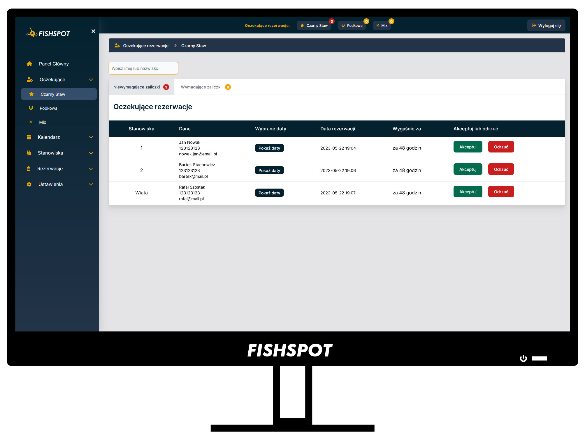 Nasz system rezerwacji dostarcza Ci natychmiastowego podglądu wszystkich złożonych rezerwacji. Otrzymujesz powiadomienia o nowych rezerwacjach, a zintegrowany panel umożliwia Ci szybką akceptację lub odrzucenie zgłoszeń. Dzięki temu nie tracisz czasu na odbieranie telefonów, a wędkarze otrzymają natychmiastowe potwierdzenie swoich rezerwacji. Sprawniejsza obsługa rezerwacji to zadowoleni wędkarze!